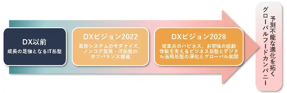 トリドールグループは、「唯一無二のグローバルフードカンパニー」の実現に向け、2019年よりDXに着手し、IT基盤の刷新と業務プロセス改革を推進してきました。現在は「DXビジョン2028」のもと、経営戦略と一体となったDXを進めています。 |