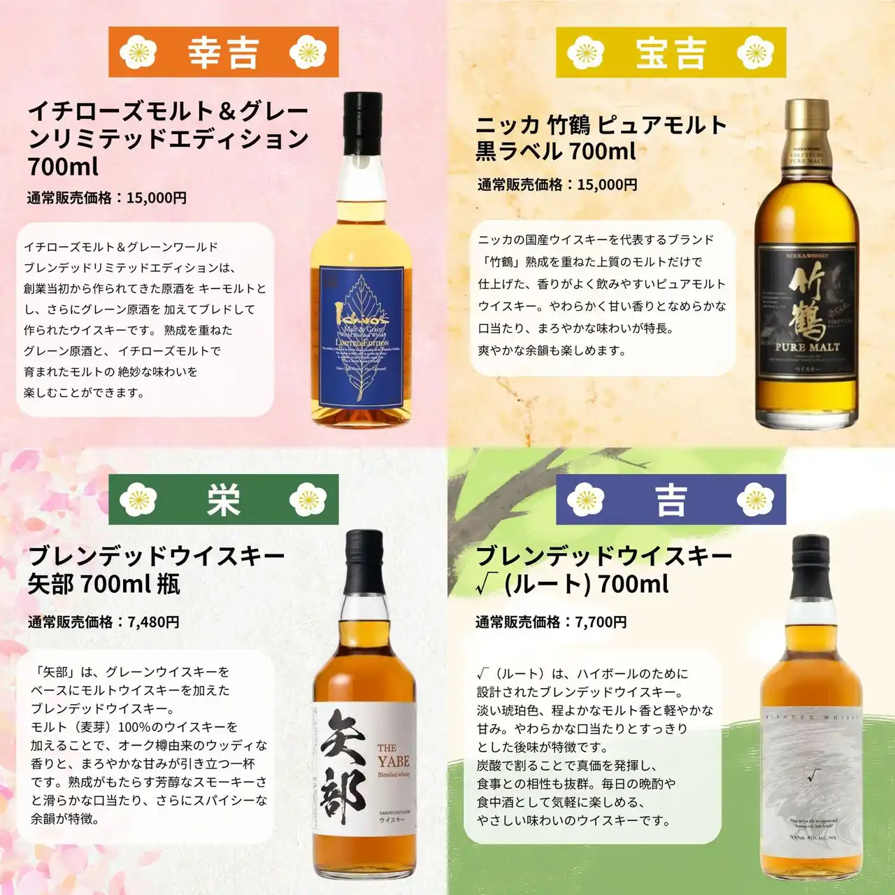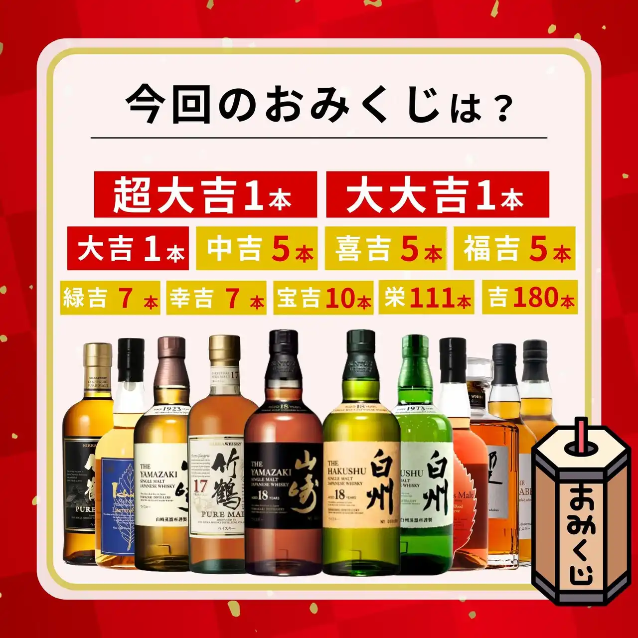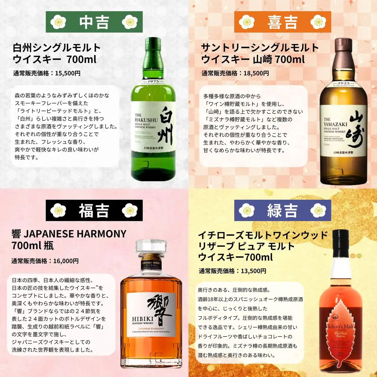 ・[超大吉×1]山崎18年 ・[大大吉×1]白州18年 ・[大吉×1]竹鶴17年 ・[中吉×5]白州シングルモルト ・[喜吉×5]山崎シングルモルト ・[福吉×5]響 JAPANESE HARMONY ・[緑吉×7]イチローズモルトワインウッドリザーブ ピュア モルト ・[幸吉×7]イチローズモルト&グレーンリミテッドエディション ・[宝吉×10]竹鶴 ピュアモルト 黒ラベル |