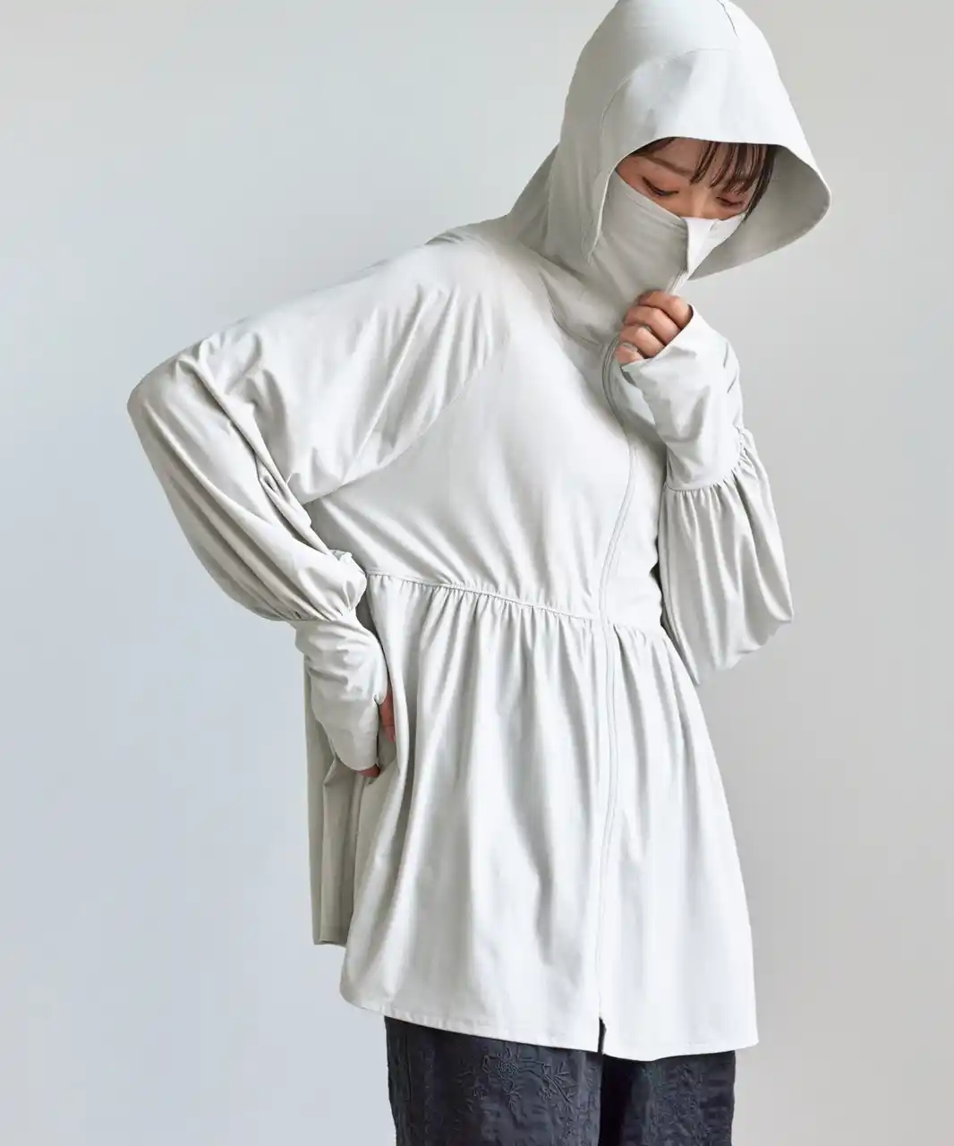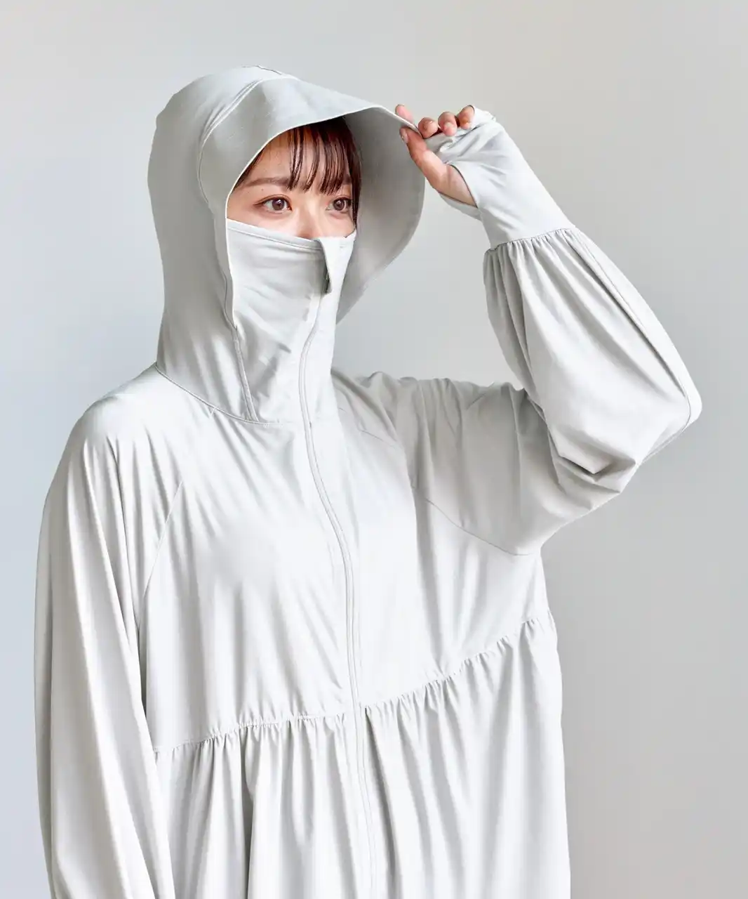 顔まわりから指先までしっかり肌を守ってくれるだけでなく、接触冷感素材により、紫外線が気になる季節も快適に着用いただけます。 つば付きのフードに加え、ファスナーを閉めることで鼻先まで覆うことができ、顔全体をしっかりカバーします。 |