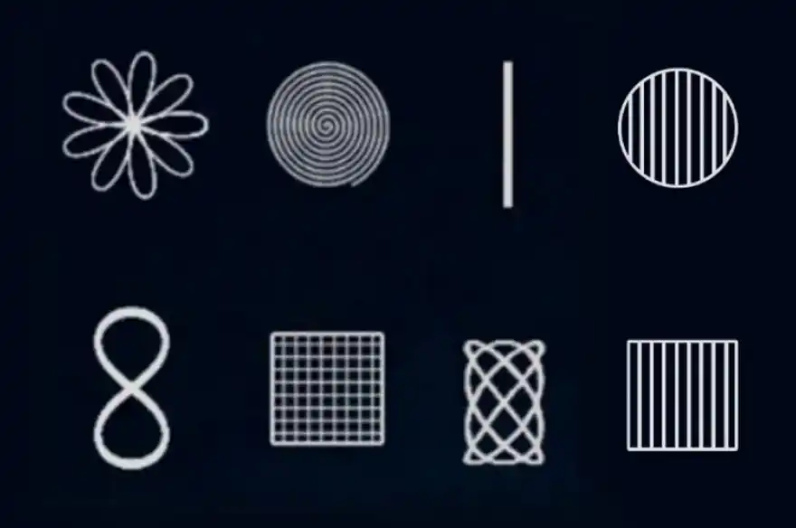 波形の形によって照射範囲や仕上がりが変わる。加工対象に応じて、照射されるレーザーの波形パターンを自由に切り替え可能。直線・螺旋状など8種類の波形があらかじめ登録されており、複雑な形状や細管、金型、工具などの細部にも最適な照射が行えます。 |
