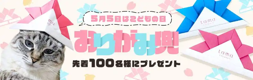 プレミアムキャットフード専門店・通販「たまのおねだり(tama)」(運営:マーケティングパートナー株式会社、本社所在地:東京都新宿区、代表取締役社長:泰地正人、Tel:03-6772-8194、https://www.tamaone.jp/)は、5月5日のこどもの日にちなみ、猫用サイズの『折り紙かぶと』を先着200名様限定でプレゼントいたします(ピンクか水色を選択。各100名様)。この『折り紙かぶと』には、子の成長を願い「いつまでも、健康で元気でいてね。」という思いを込めて、兜やこいのぼりを飾るこどもの日の風習から、「我が子のようなかけがえのない猫たちに、ずっと健康で元気にいてほしい」という願いが込められています。tamaで毎年恒例の猫用サイズの『折り紙かぶと』を、この機会にぜひお申込みください。 |