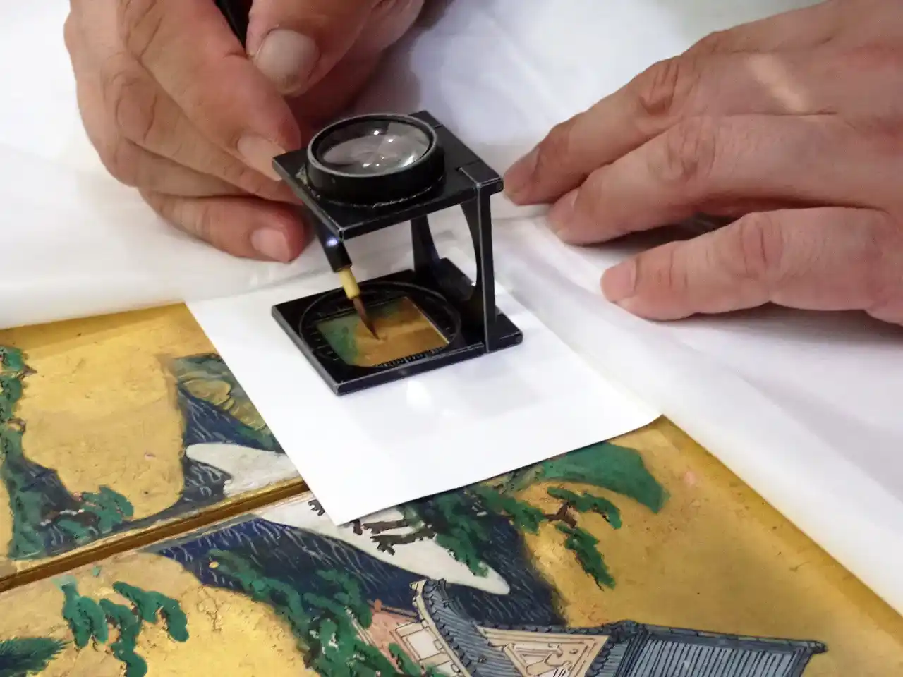 修理は文化財修理技術者の手によって、絵具がはがれている部分には筆を使って膠(にかわ)を入れて乾かし、本紙が浮き上がっている部分には新糊(小麦澱粉糊)を注入して乾かすといった、丁寧で細かな作業が繰り返し行われました。 |