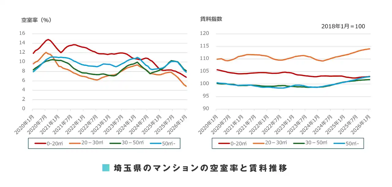 さいたま市ではアパート・マンションのすべての面積帯で空室率の改善が継続しています。アパートの20-30平方メートル 、50平方メートル -、マンションの30-50平方メートル で前月比の支払い賃料が下落したものの、前年同月比の支払い賃料はアパートの50平方メートル -を除いて上昇傾向を維持しています。アパートの50平方メートル -の支払い賃料は2023年半ば以降下落が継続しており、2018年1月の水準を大きく下回っています。交通利便性の悪い地域の物件が家賃を下げて空室を埋めている可能性があります。 |