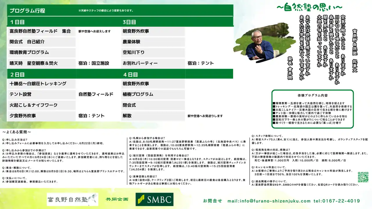 ぜひこの機会に、SMBC×富良野自然塾 共同企画のグリーンキャンプにご応募ご参加ください。 富良野でお待ちしております。 |