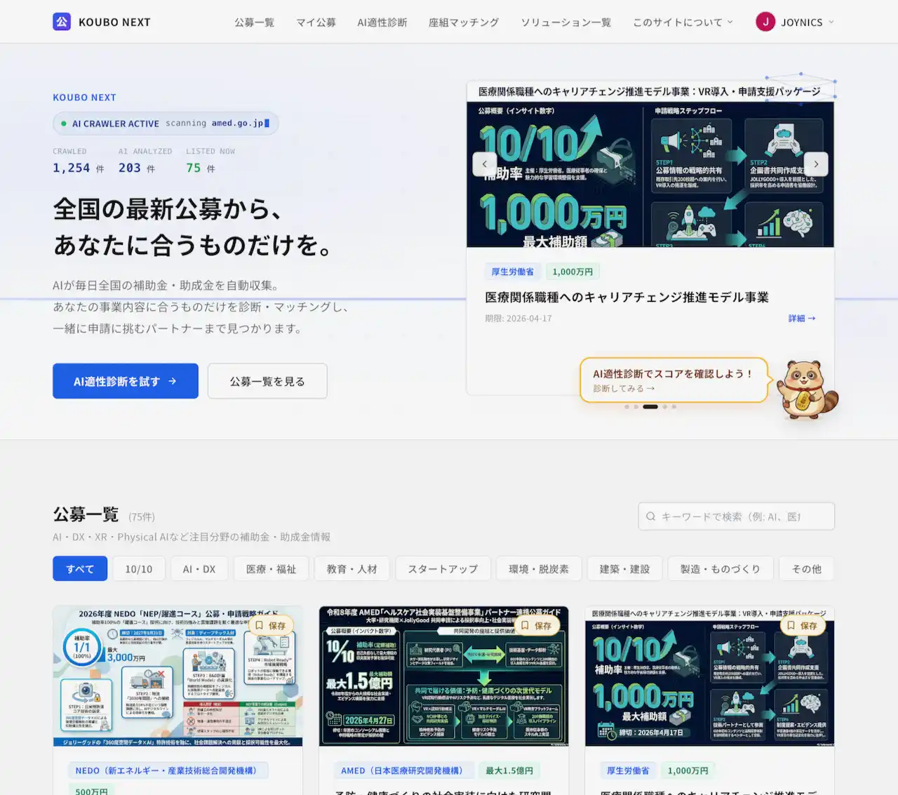 ■ 「KOUBO NEXT」について https://koubonext.com/ 「KOUBO NEXT」は、AIによる公募要件診断および最適な企業間のコンソーシアム(座組)を自動マッチングする次世代プラットフォームです。(開発・運営:JOYNICS LLC) |