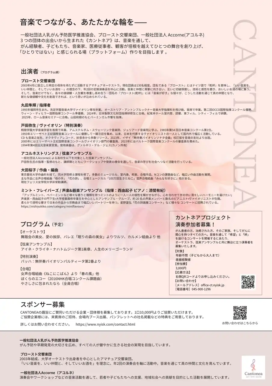 一般社団法人 乳がん予防医学推進協会、プロースト交響楽団、一般社団法人Accorne(アコルネ)は音楽を通じてがんと向き合う人々を支える共創型プロジェクト「CANTONEA(カントネア)」 |