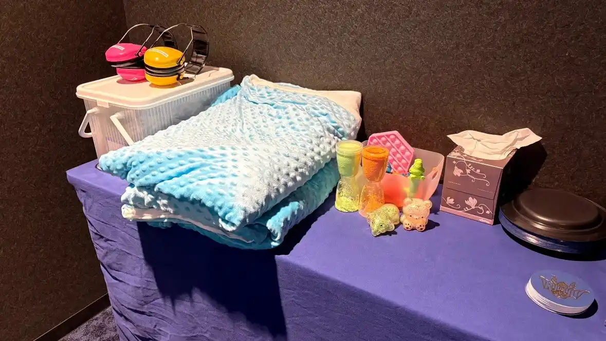 フレンドリールームの設置にあたり沖縄県発達障がい者支援センターご協力のもと、沖縄サントリーアリーナ内にある既存のスイートルームを活用し、音や光の刺激を抑える為に室内スピーカーをオフにし、ブラインドを下ろすことで室内の明るさ調整をできるようにし、イヤーマフや加重ブランケットの貸し出しを行い、実際に感覚過敏の方に試合観戦を体験していただきました。 |