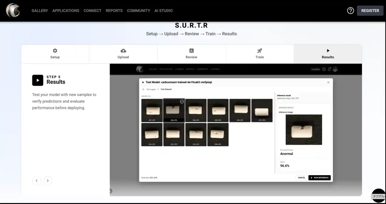 本機能により、研究者・技術者・現場担当者自身が、画像データのアップロードからアノテーション、AIモデルの構築・評価・運用までを、CarbConnect(R)上でシームレスに実行できるようになります。AI活用に必要だった専門人材への依存や外部委託の壁を取り除き、「データを持つ現場」がそのまま「AIを創り、使う現場」へと変わる研究・業務プロセスの根本的な変革を実現します。 |