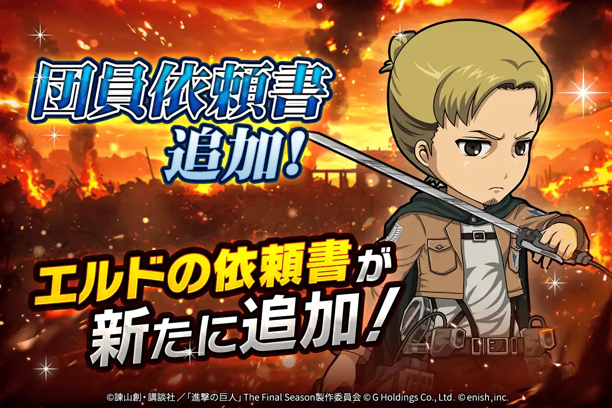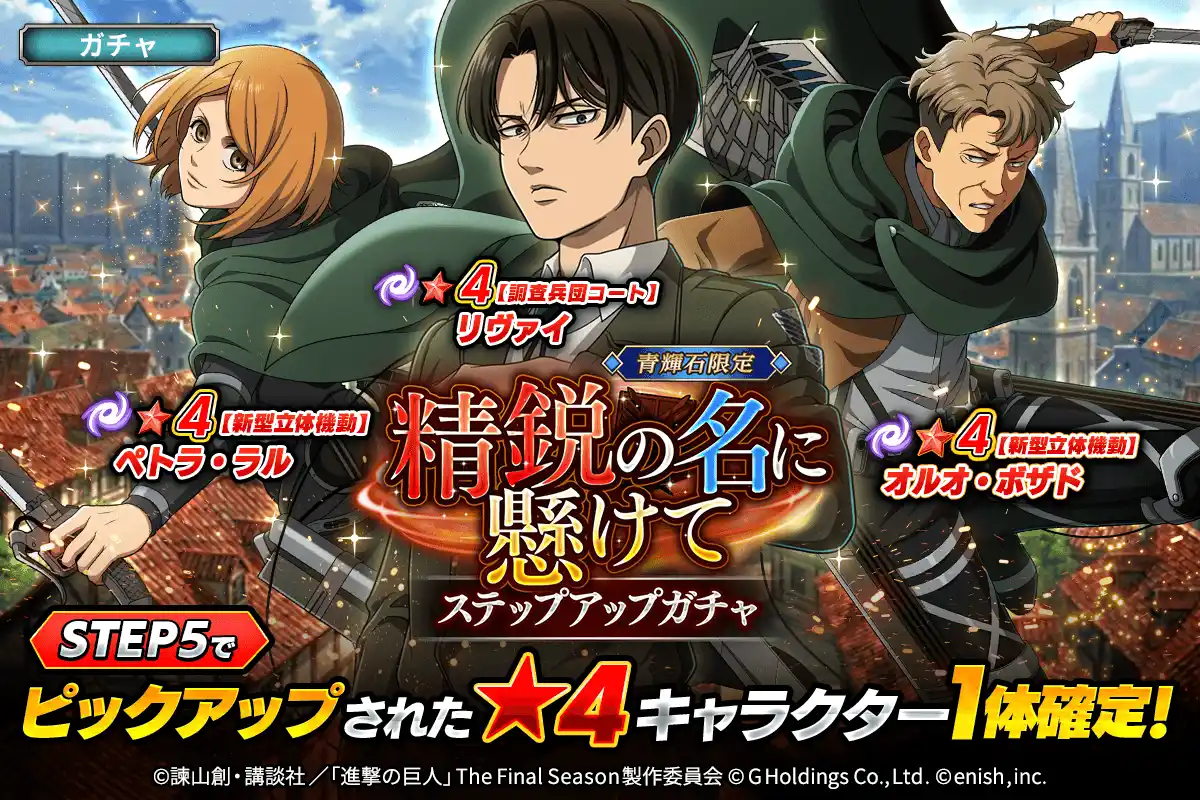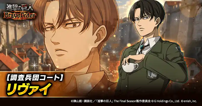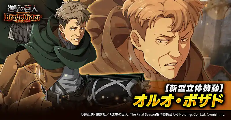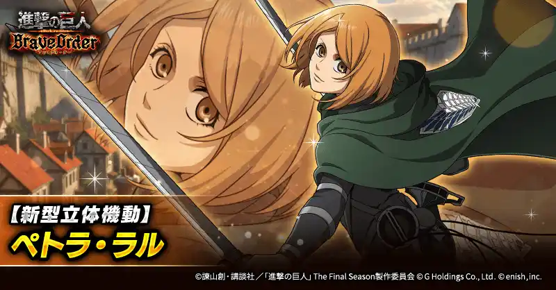 | 株式会社enish(本社:東京都港区、代表取締役社長:安徳 孝平、以下enish)は、アニメ『進撃の巨人』のスマートフォンゲーム最新作「進撃の巨人Brave Order」にて、2026年4月10日(金)より、新イベントの精鋭の名に懸けてを開催!また、本日より【調査兵団コート】リヴァイ、【新型立体機動】ペトラ・ラル、【新型立体機動】オルオ・ボザドが登場する「精鋭の名に懸けてガチャ」も開催!その他、最新情報はゲーム公式サイト・ゲーム公式X(旧Twitter)アカウントにて随時公開して行きますので、ぜひご覧ください。 | |||