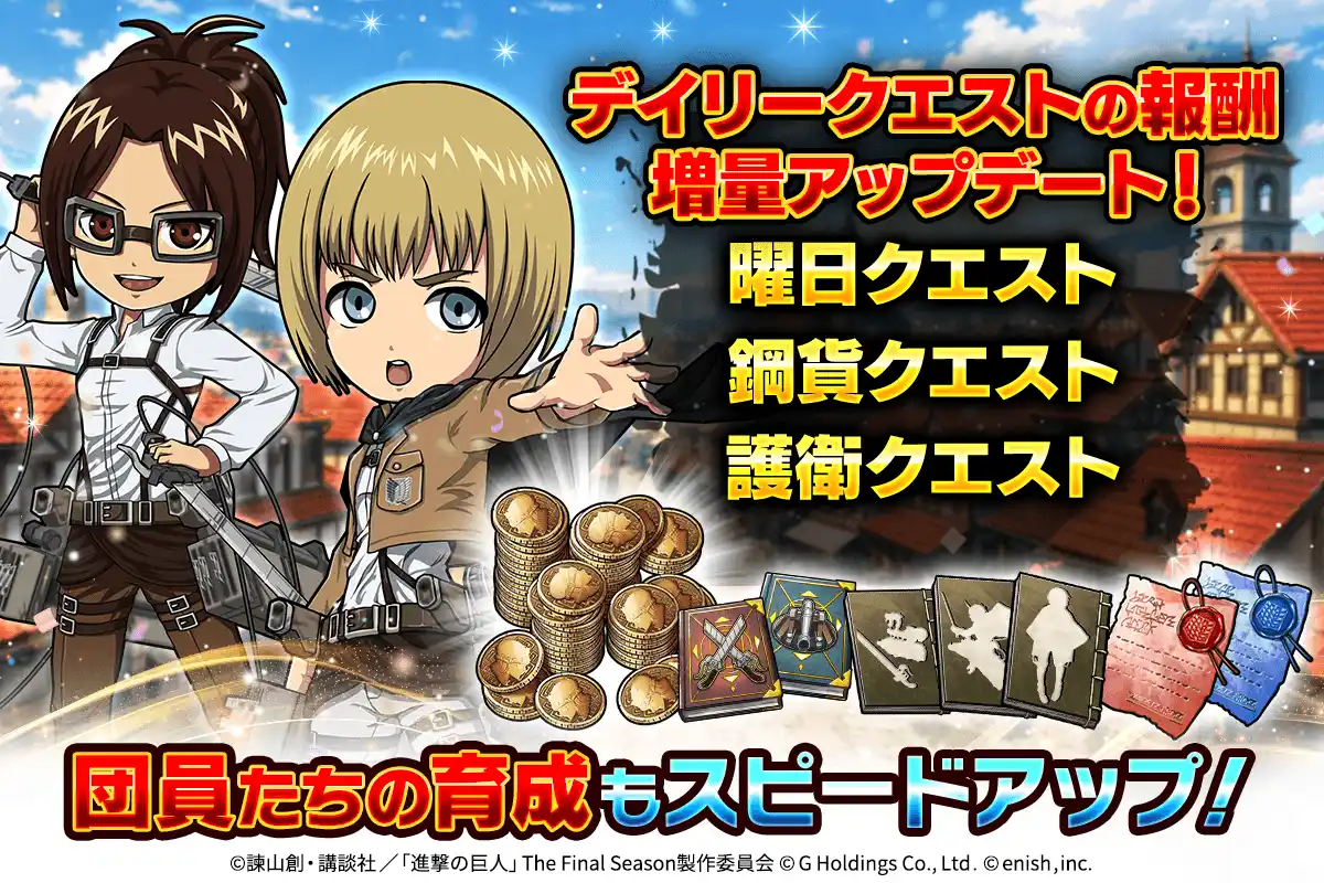 | 本日、2026年4月10日(金)にデイリークエストの報酬を増量アップデート。団員たちの育成もスピードアップ! | |||