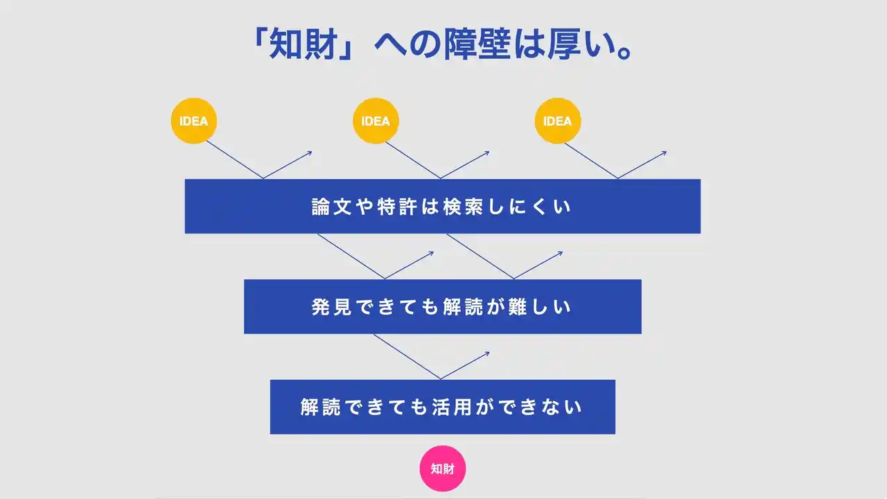 その背景には「探せない・わからない・つながらない」という3つの構造的な障壁があります。特許データベースは専門家向けに設計されており、一般の事業者やクリエイターが必要な技術にたどり着くこと自体が困難です。仮に見つけられたとしても、特許文書は権利を守るための法律言語で書かれているため、その技術が「何に使えるのか」を直感的に理解することができません。さらに、技術を理解できたとしても、発明者にどうコンタクトすればいいのか、誰と組めば実装できるのかがわからない。技術と事業をつなぐ導線が、そもそも存在していないのです。 |