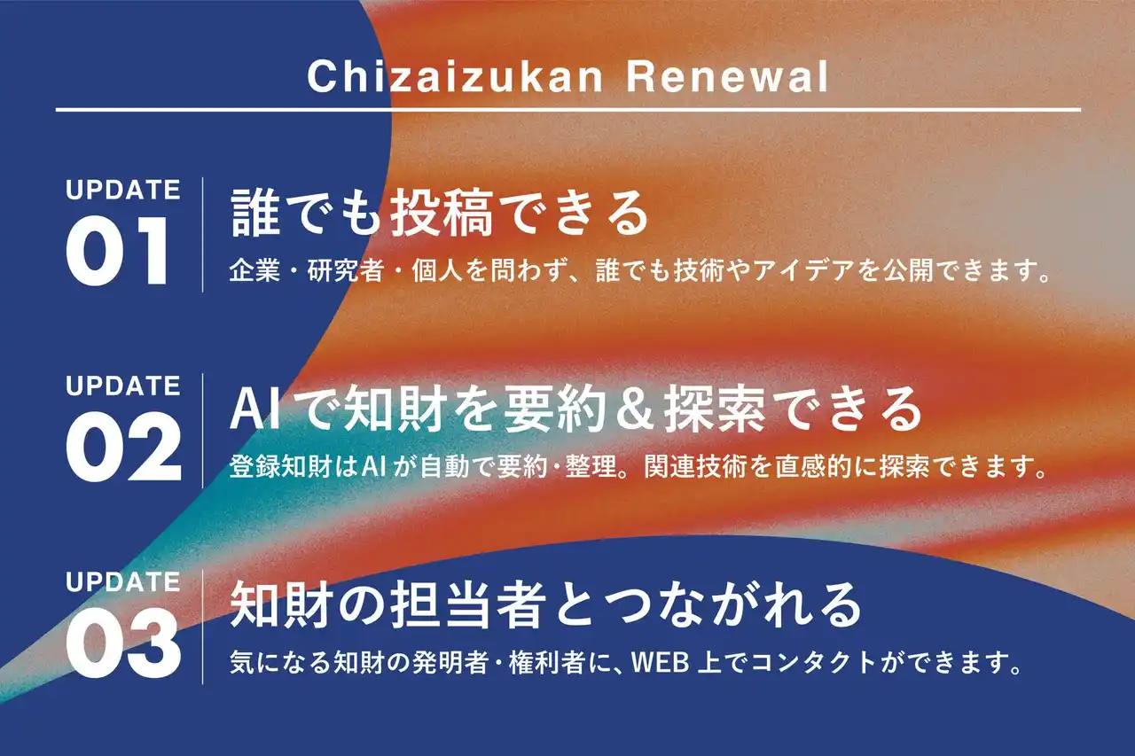 本プロジェクトでは、知財図鑑のWebサイトを全面的にリニューアルし、誰もが技術情報を投稿・探索・接続できるオープンな知財プラットフォームへと転換します。これまで編集部が担ってきた「技術を翻訳して届ける」という役割をひらき、企業・研究者・個人を問わず誰でも参加できる仕組みへと器ごと変えます。主なアップデートは以下の3点です。 |