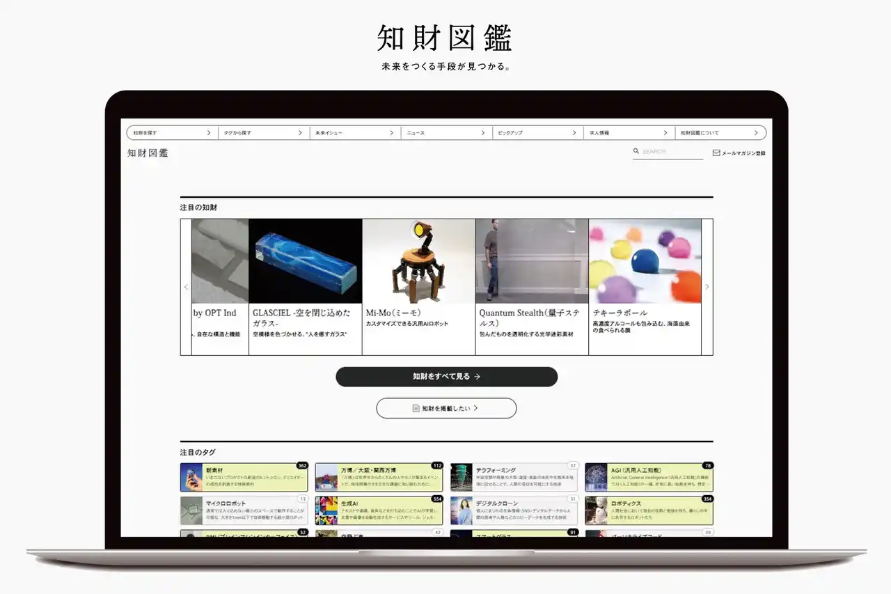 知財図鑑は「世界を進化させる知財」に出会えるイノベーションメディアです。データベースとしての機能に留まらず、クリエイター視点で知財を翻訳する「知財ハンター」を組織し、新規事業のためのAIコンサルティングやマッチングを行います。多分野で培ったクリエイティブの知見を活かし、先端技術や未来の課題を横断し、様々な産業における事業創出をサポートしています。 |