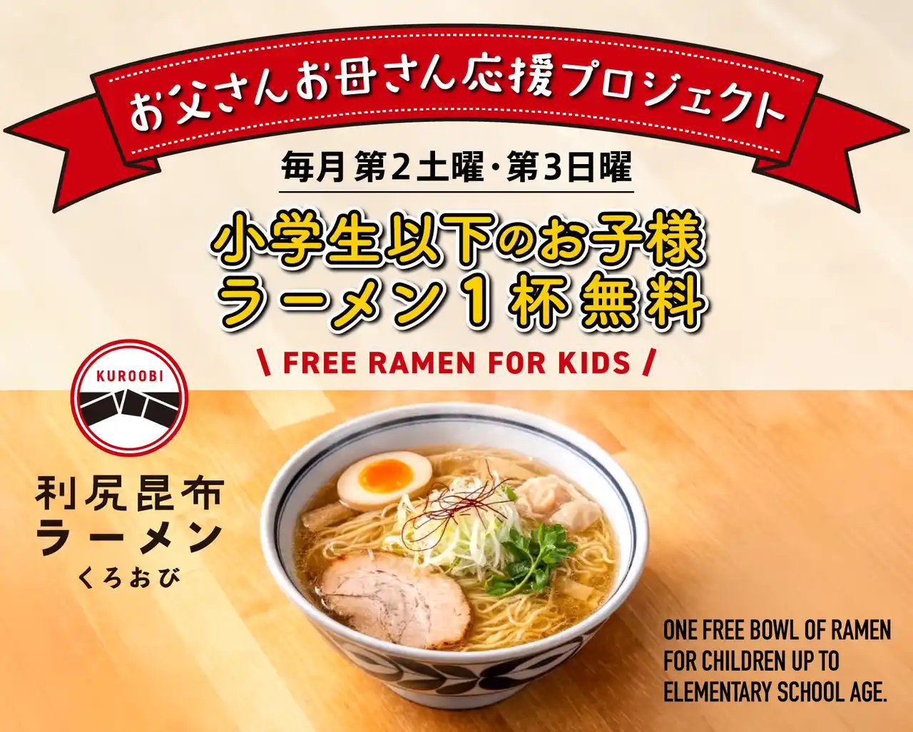 | 利尻昆布ラーメンくろおび(運営:株式会社竹田恒泰事務所)は、令和8年4月11日「お父さんお母さん応援プロジェクト」を開催。毎月第2土曜・第3日曜の対象日に小学生以下のお子様へラーメン1杯を無料で提供。 |