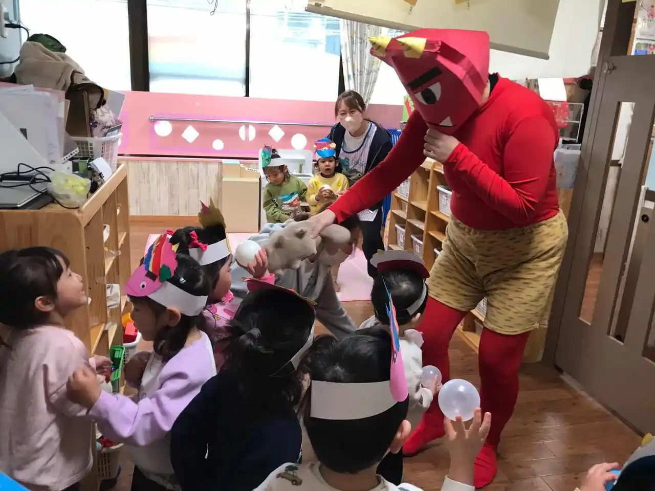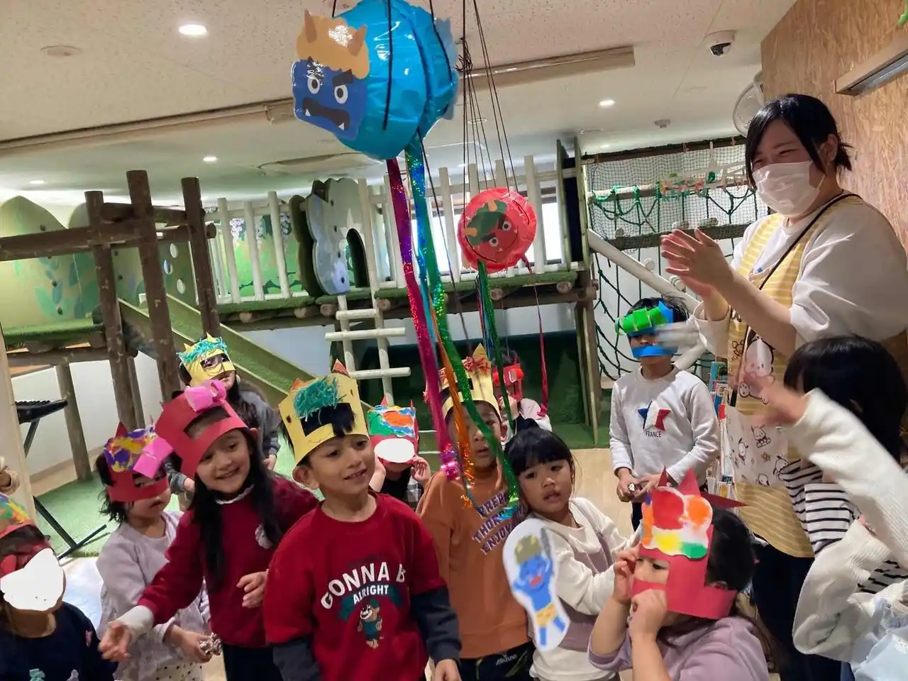 | 幼児クラスでは、「心の中の鬼」をテーマに活動を実施。福の神の登場もあり、行事の意味を体感する機会となりました。 | |||||||||