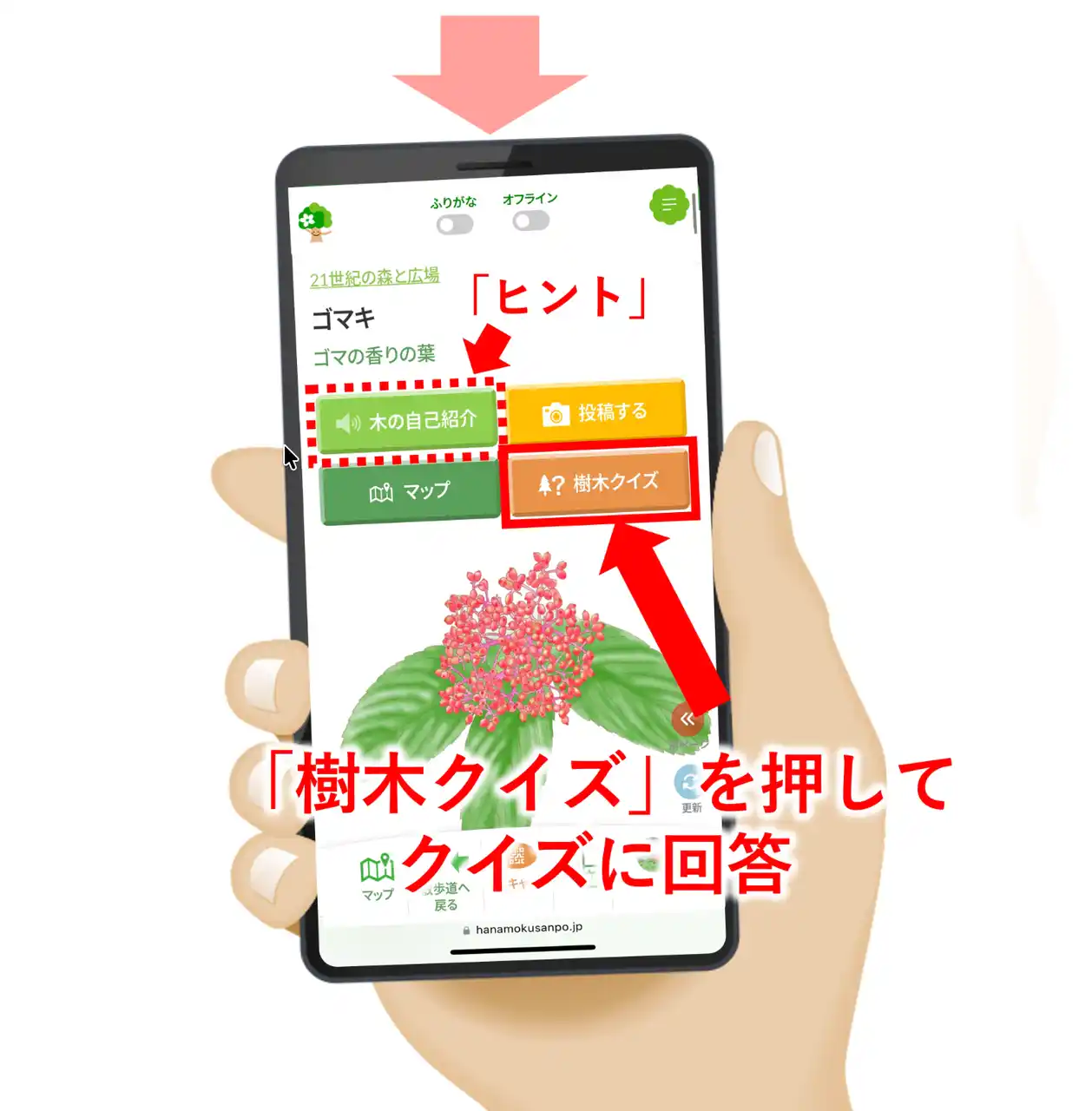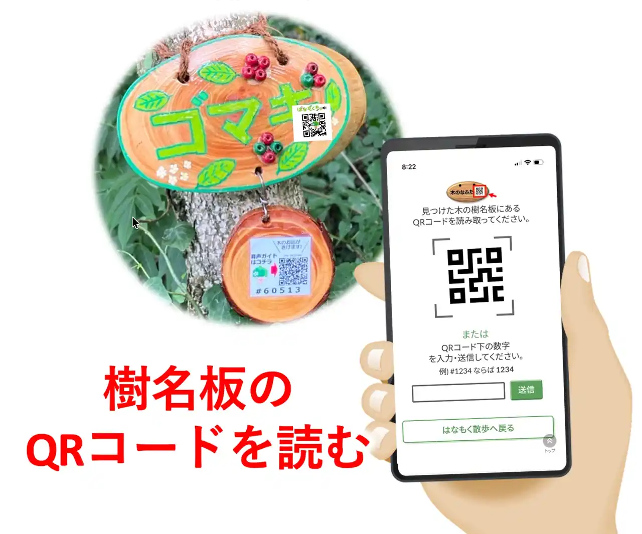 | 木を探す: お手持ちのスマートフォンで「はなもく散歩」を開き、地図を手がかりに樹名板を探します。 | |||