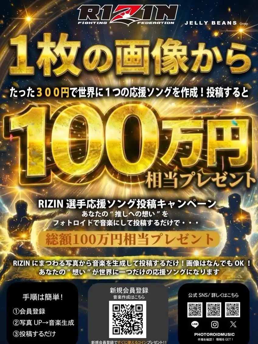 正式リリースを記念し、同日開催の「RIZIN LANDMARK 13 in FUKUOKA」と連動した総額100万円相当のプレゼントキャンペーンを実施いたします。RIZINにまつわる画像からフォトロイドミュージックで楽曲を作成し、SNSに投稿するだけで豪華賞品が当たるチャンスです。 |