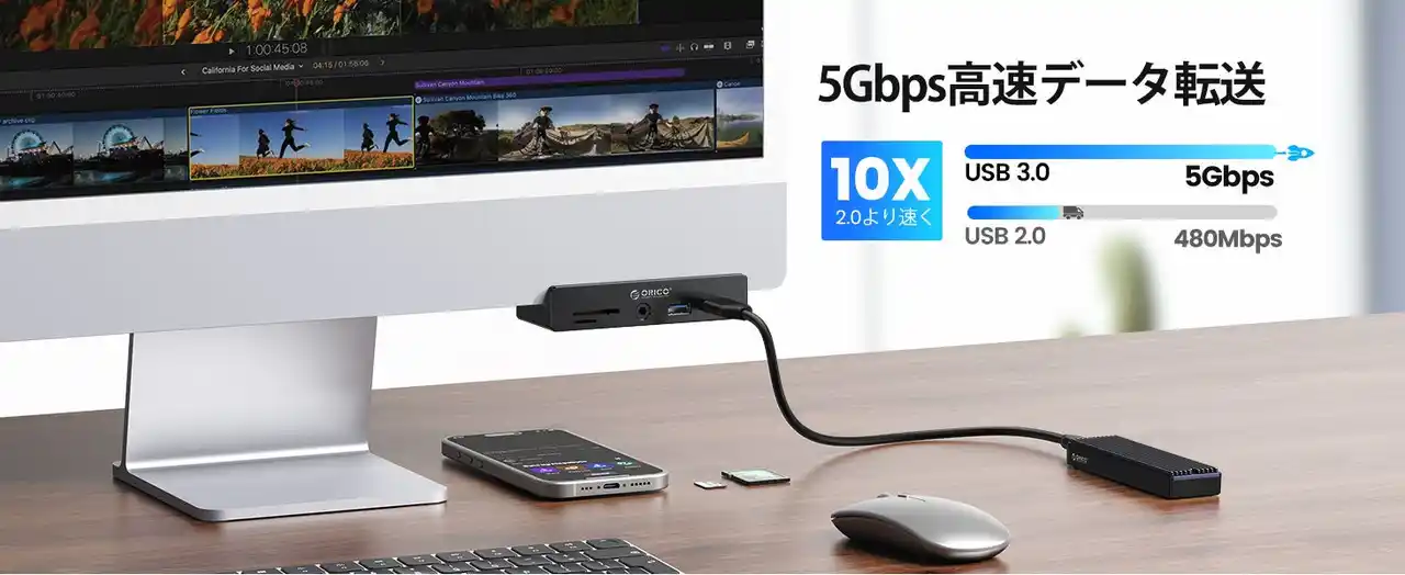 モニターやデスクの端にガッチリ固定できる、**ORICOのクランプ式5ポートUSBハブ(MH5PMM)**です。これ一台で、デスク環境が劇的にスマートになります。 |