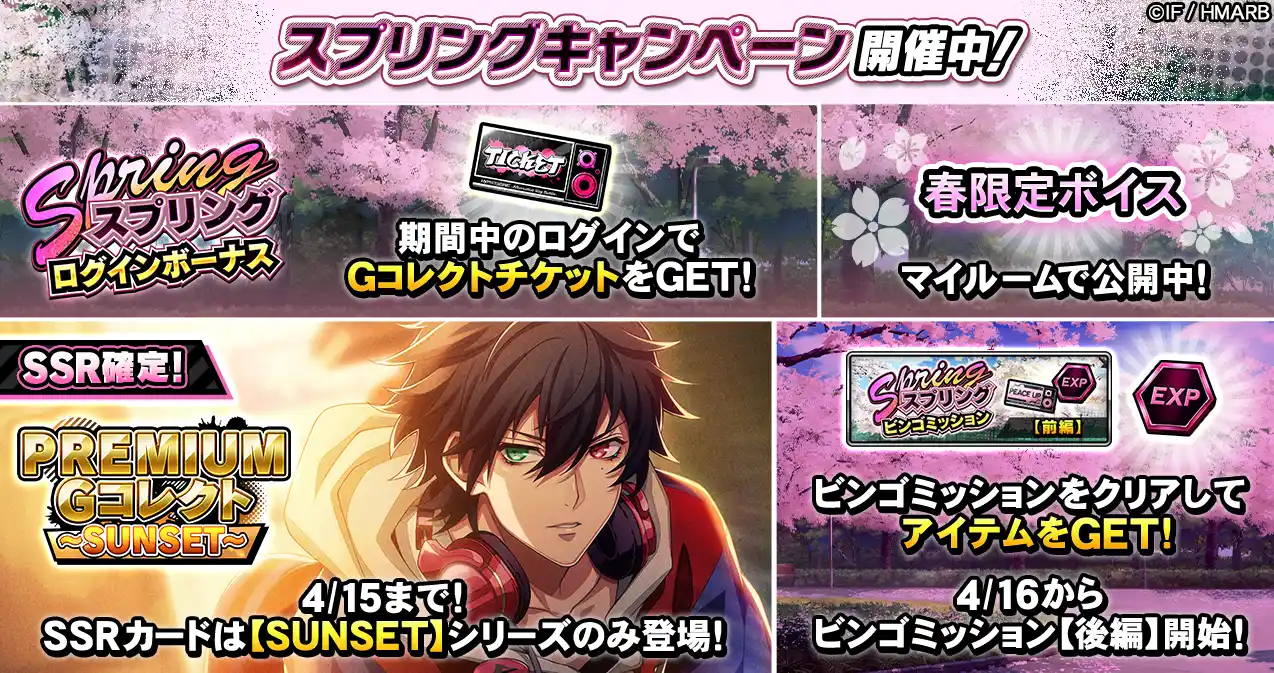 | 期間中、ビンゴミッションやログインボーナスを開催しているほか、マイルームでは「春」に関するボイスを公開中です。 | |||
