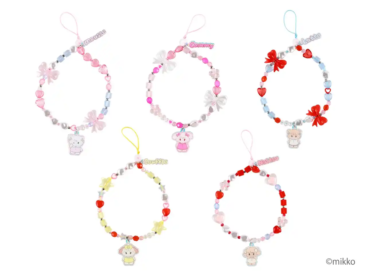 (展開デザイン)ムース、ラテ、キャミー、スフレ、ナッツ ※全5デザイン スマートフォンに装着すればリストストラップに、バッグにつければバッグチャームにもなる2WAYアイテムです。 ※「ビーズリストチャーム」は製造上の都合により、発売日が他商品と異なります。4月24日(金)以降順次販売開始予定です。 |