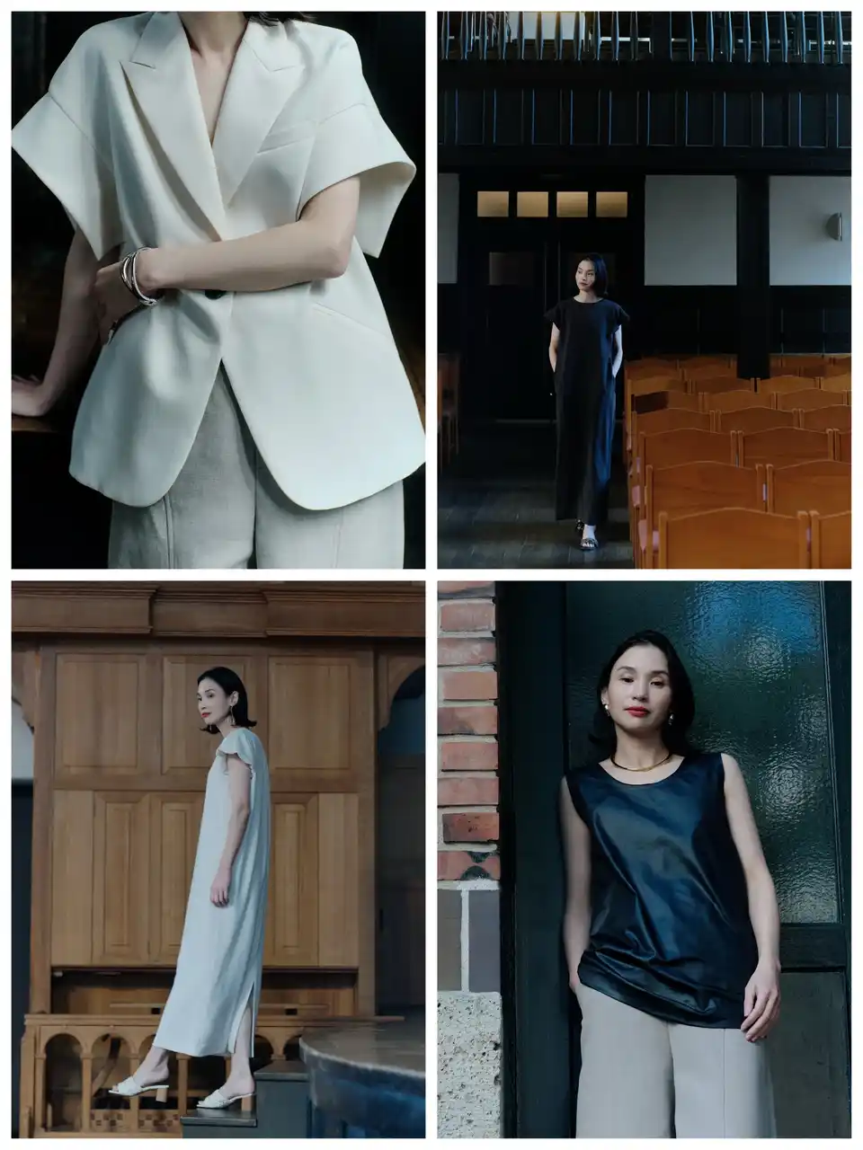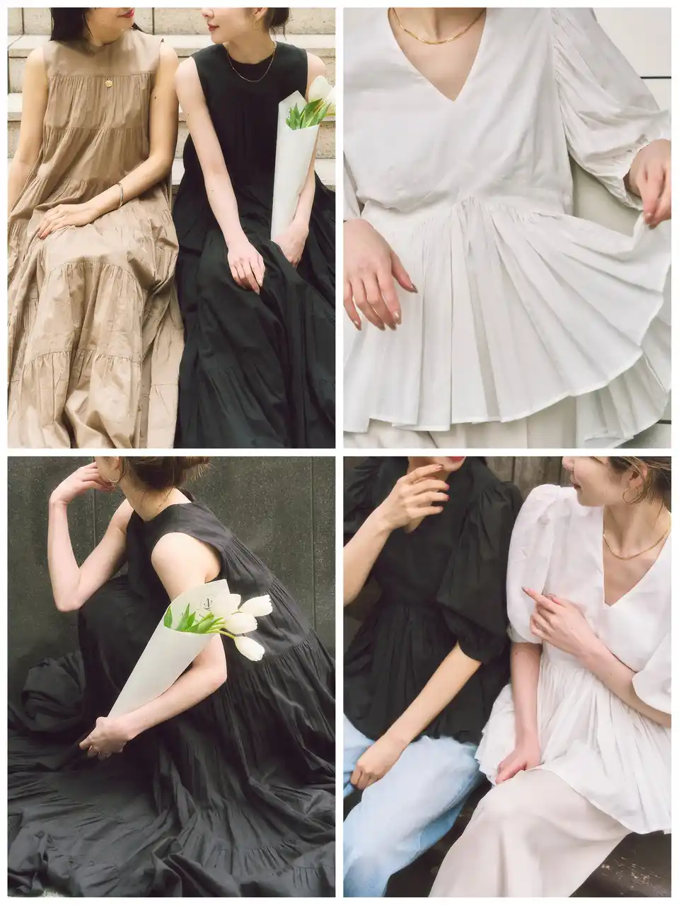 左上:「ストラクチャードウールジレ/¥45,100(税込)/ELENI」 右上/左下:「ビローギャザーワンピース/¥34,100(税込)/ELENI」 右下:「ストラクチャードサテンブラウス/¥34,100(税込)/ELENI」 |