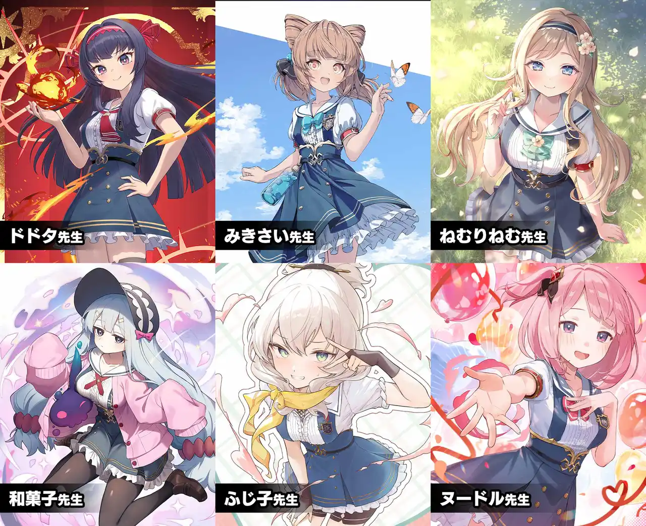 学園編では、ドドタ先生、みきさい先生、ねむりねむ先生、ふじ子先生、和菓子先生、ヌードル先生描き下ろしの学園乙女&エリオが登場します。 |