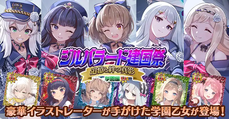 11周年記念イベント第二弾として、「カレン」「チコ」「カモミール」「アンゼリカ」「ルベリス」の学園乙女をメインとしたイベント『ジルバラード建国祭 追憶と絆の真影 学園編』を開催中です。 |