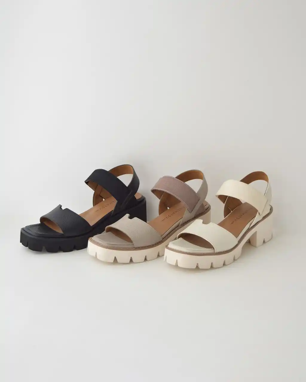 レトロモダンな雰囲気をもつプチスリットの入ったシンプルサンダル。どんなスタイルにも合わせやすいデザインと、軽量厚底ソールでスタイルアップも叶う1足持っていたいアイテム。 |