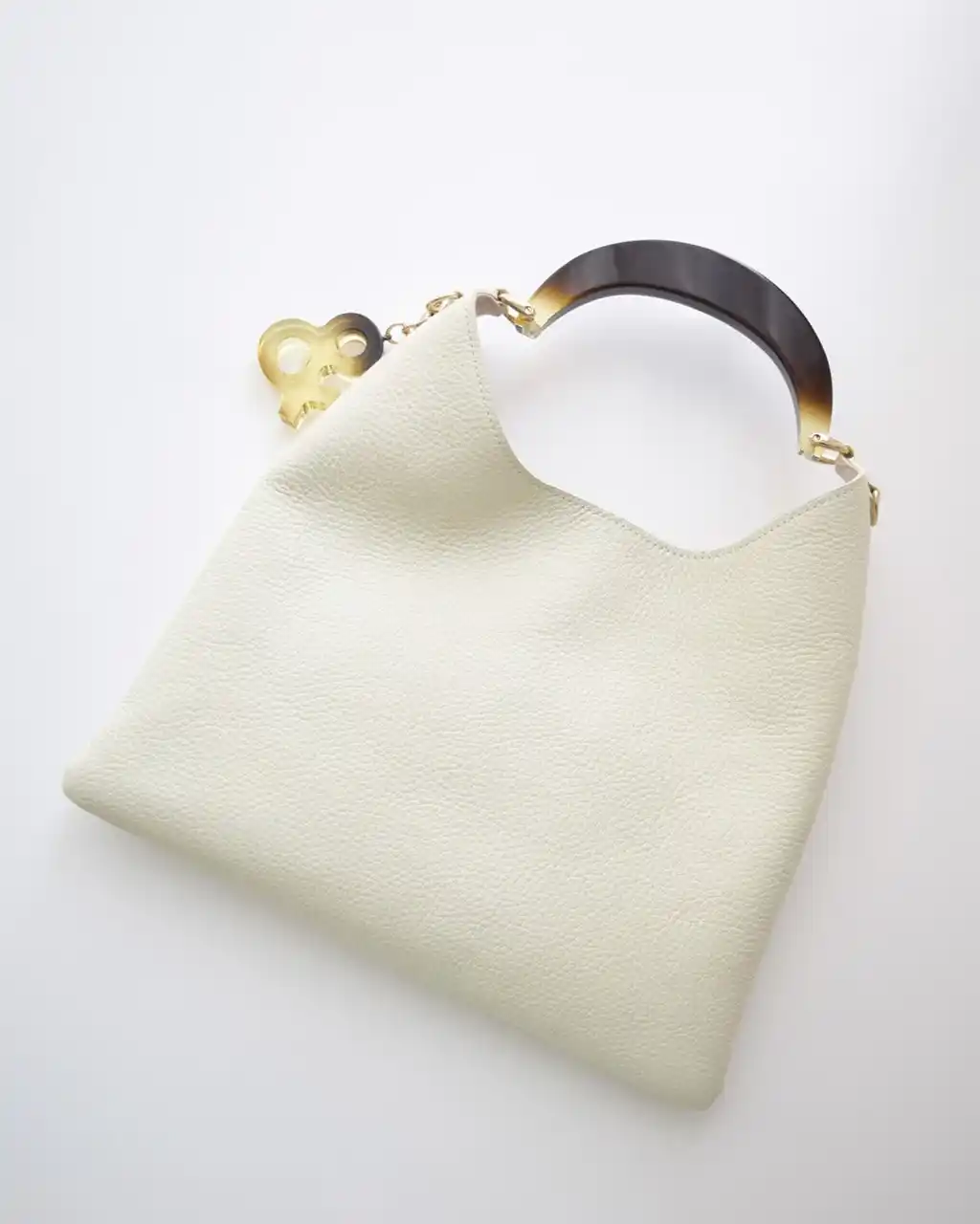 ハンドル、本体(革・裏地)ともに生分解性の高い"土に還る"素材を使用したハンドバッグ。 |