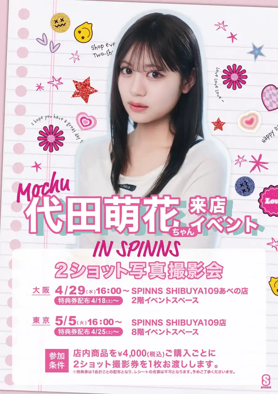 | 大人気恋愛リアリティ番組への出演をきっかけに、共感と憧れを集めZ世代から絶大な人気を誇る大人気モデル・インフルエンサーの『代田 萌花(もちゅ)』との2ショット写真撮影会を「SPINNS SHIBUYA109店(東京)」と「SPINNS SHIBUYA109あべの店(大阪)」にて開催いたします。 | |||