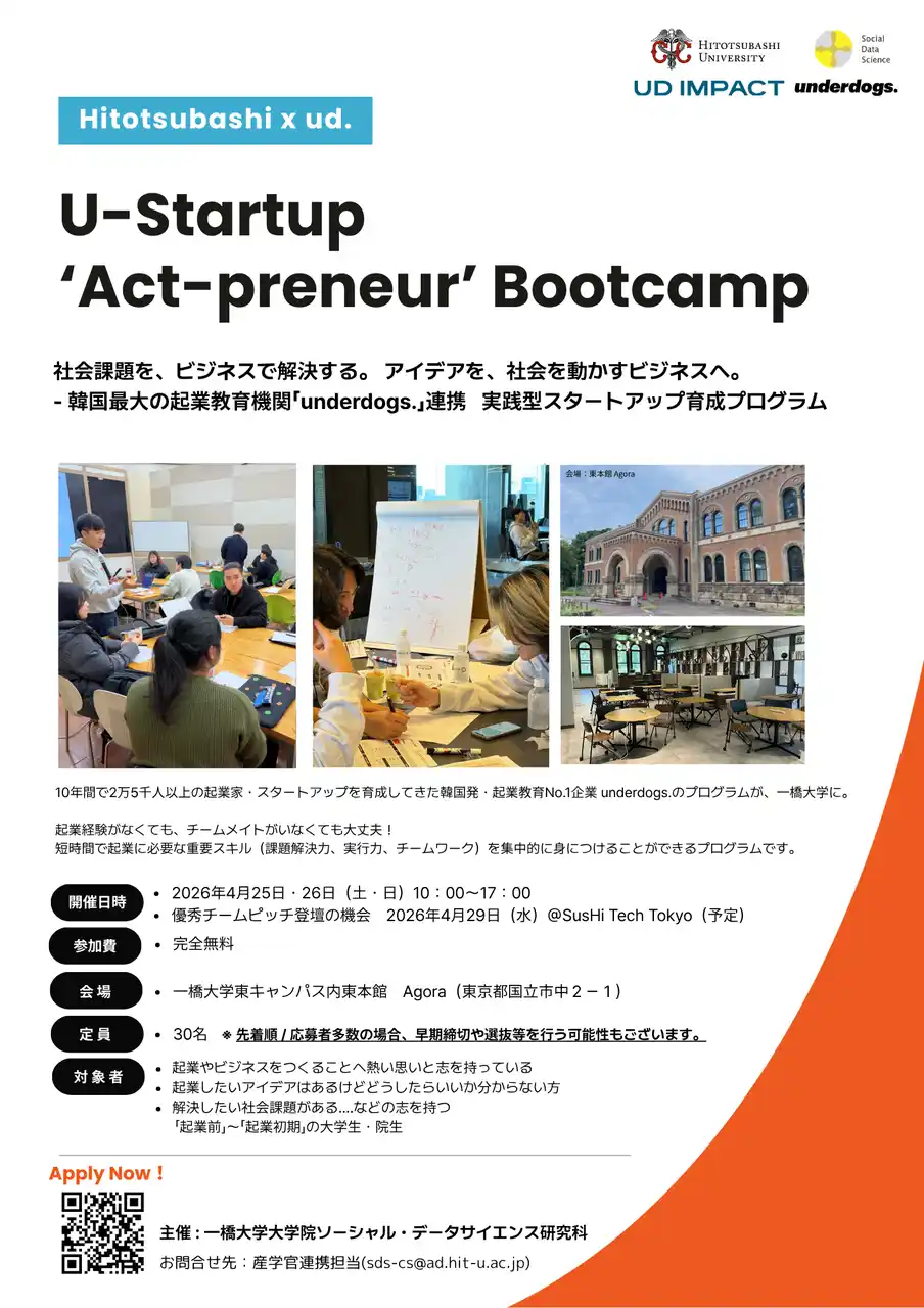 本連携の第一弾として、起業前段階の学生を対象とした実践型プログラム「Hitotsubashi x ud. U-Startup “Act-preneur” Bootcamp 2026」を2026年4月25日(土)・26日(日)10:00~17:00に開催予定です。本プログラムは、現在参加者を募集しています。 |
