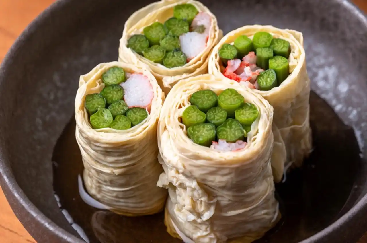 ゆばや薄焼き卵で巻くと素敵な一品に |