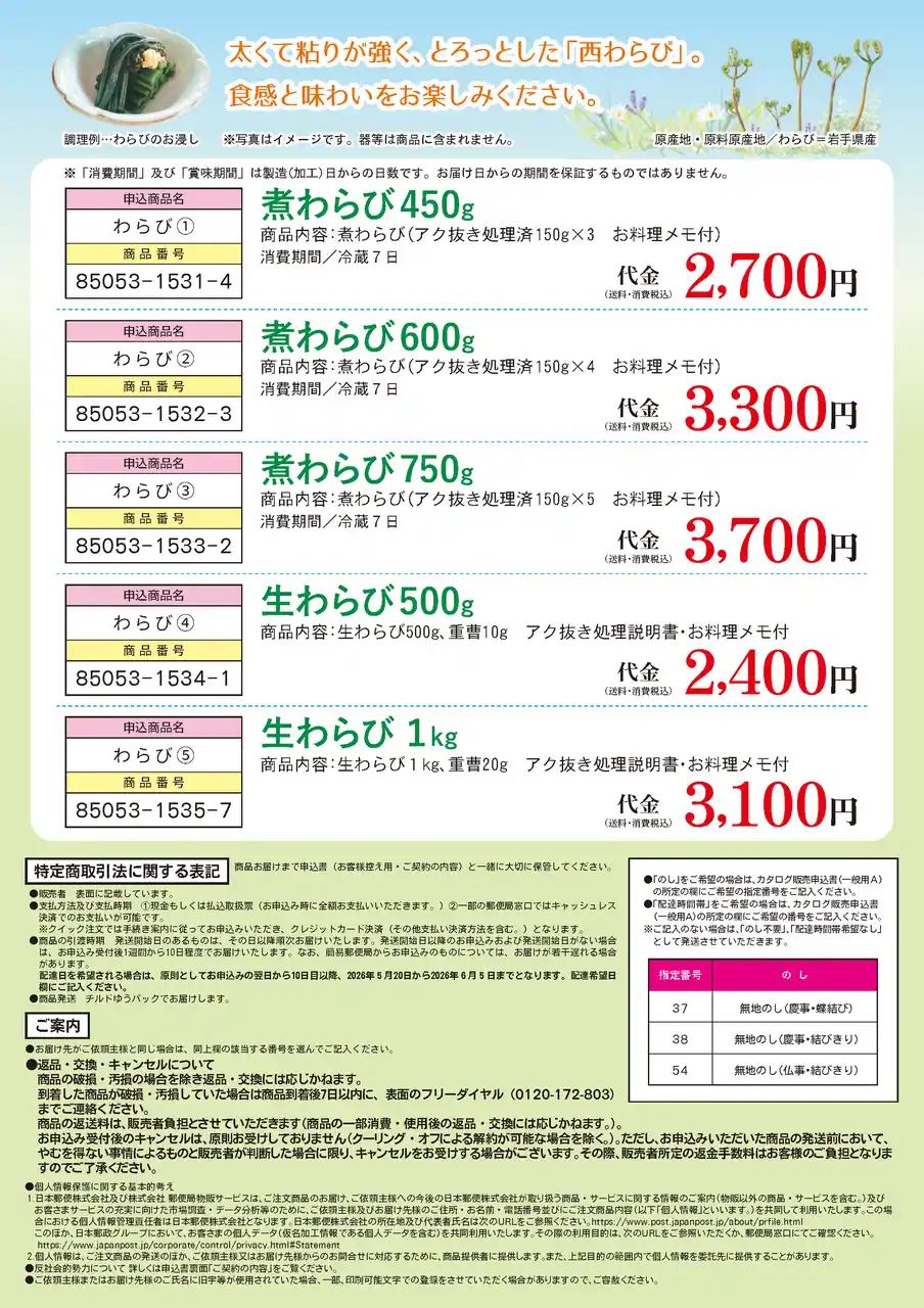 短い旬の味覚を逃さず楽しめるこの機会に、西和賀町の春の訪れを感じる「西わらび」をぜひお召し上がりください。ご自宅用はもちろん、春の贈り物としてもおすすめです。 |