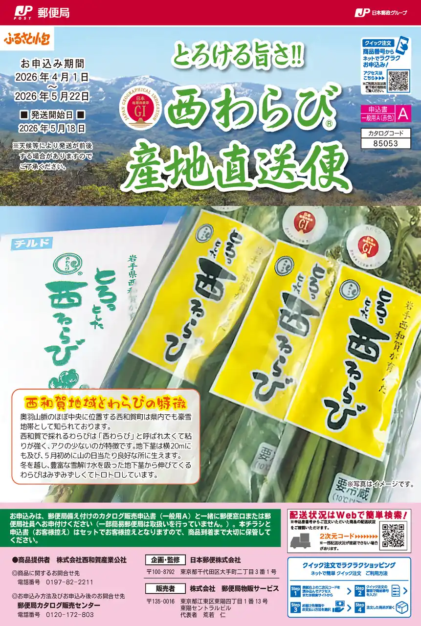 株式会社西和賀産業公社(岩手県西和賀町/代表取締役 内記和彦)は、雪解けとともに旬を迎える西和賀町を代表する特産品「西わらび」の予約受付を開始いたしました。 |