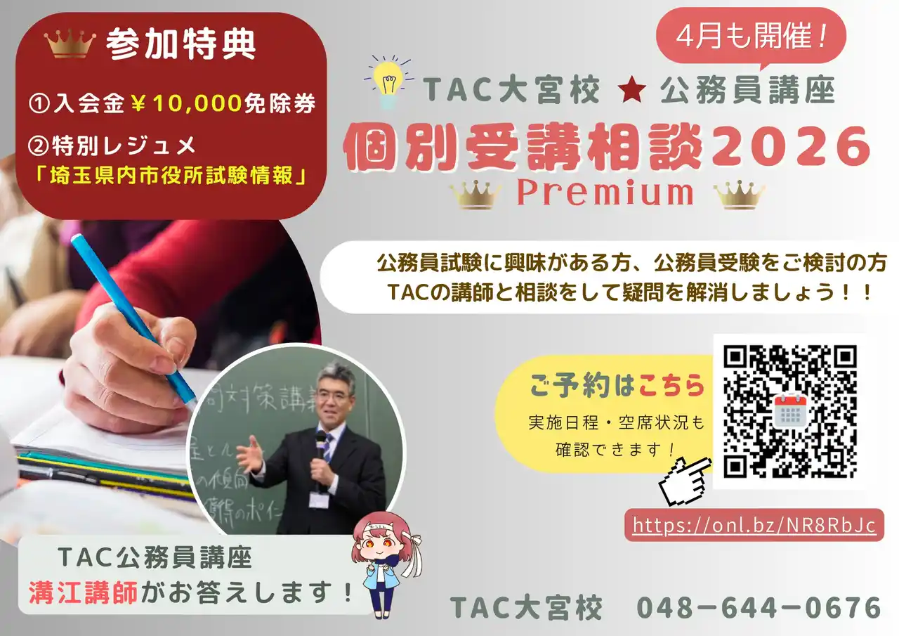 公務員試験対策講座を展開しているTAC株式会社(東京都千代田区)は、TAC大宮校にて「公務員講座 個別受講相談2026 Premium」を4月も開催中です。 |