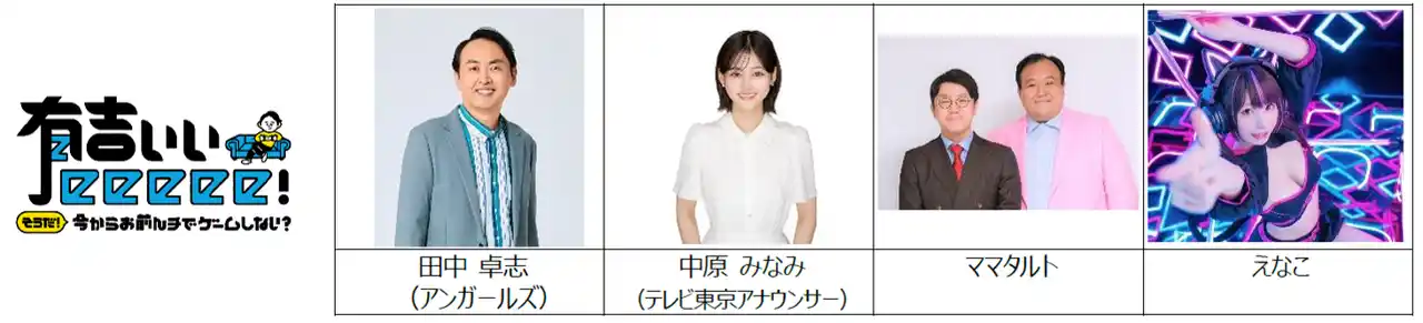テレビ東京の人気番組「有吉ぃぃeeeee!」のニコニコ超会議出張版として、「アンガ・田中・ザンギエフを倒せ!挑戦者求ム!」を開催します。アンガールズの田中卓志が芸能界最強を目指し、ニコニコ超会議の超ゲームエリア メインステージで来場者と『ストリートファイター6』の真剣勝負を実施します。また、「有吉ぃぃeeeee!」公式の配信&物販スペースが設けられ、お笑いコンビ・ママタルトがリアルタイムで配信。4月26日(日)にはスペシャルゲストにコスプレイヤー・えなこも登場します。 |