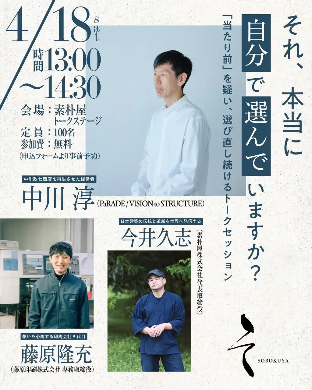 日本の伝統的な大工技術と、自然と共に生きる建築の知恵を受け継ぎながら、持続可能な建築を追求する素朴屋(本社:山梨県北杜市、代表取締役:今井久志)は、2026年4月18日(土)に本社敷地内にて「原木市」を開催いたします。本イベントは、日頃からお世話になっている地域の皆さまへの感謝と、新しい年のはじまりのご挨拶を込めて2020年より毎年開催しているものです。 |