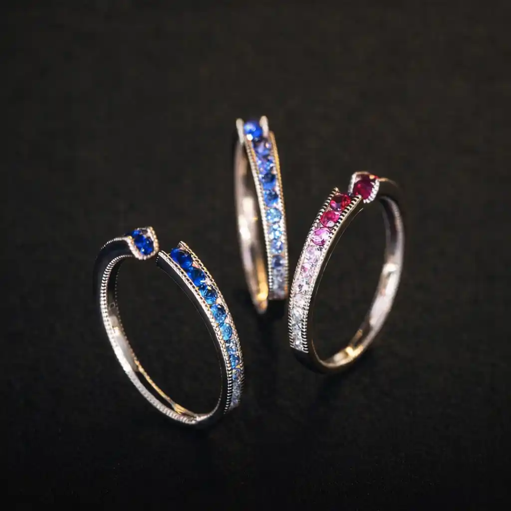 極小の爪でカラーストーンやダイヤモンドを隙間なく留めたパヴェリングは、光が指先を流れるような輝きと、立体感ある表情が魅力です。