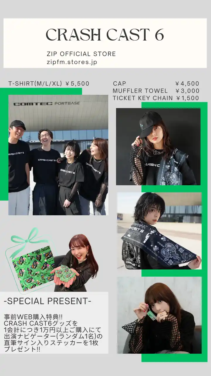 Tシャツ、キャップ、マフラータオルはZIP-FM ナビゲーターの永田レイナがデザインを担当。事前WEB購入特典として、「舞台:CRASH CAST6」オフィシャルグッズを1会計につき1万円以上ご購入にて出演ナビゲーター(ランダム1名)の直筆サイン入りステッカーをプレゼントします。 |