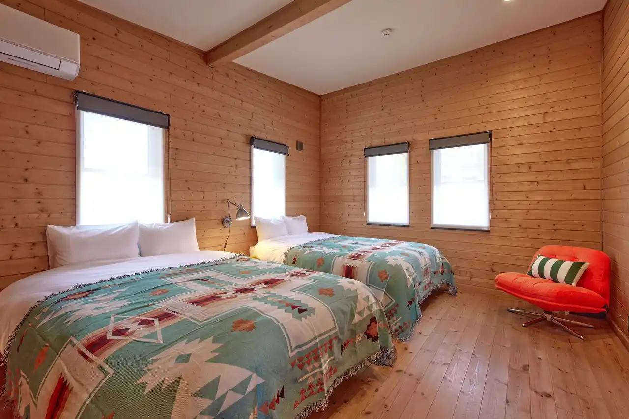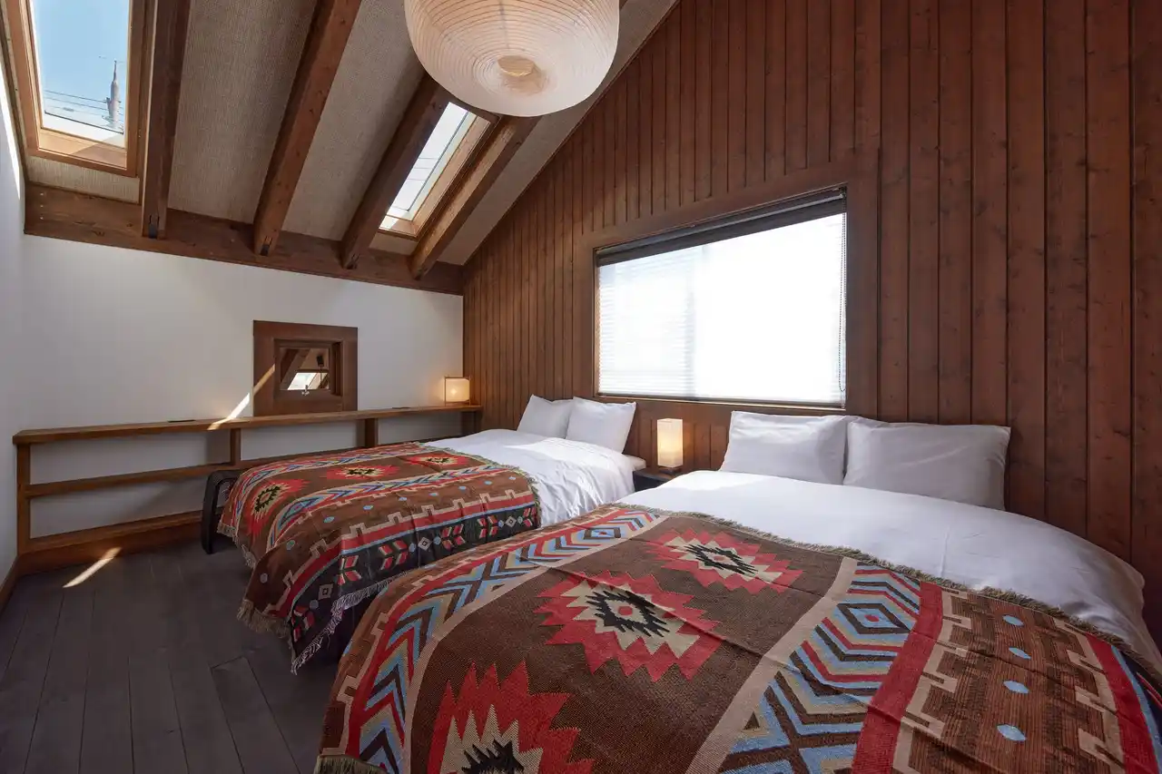 寝室は複数用意されており、最大14名まで宿泊可能。中でも、天井に窓を設けた寝室では、朝はやわらかな光を感じながら目覚めることができ、空間全体の開放感をより一層引き立てます。グループやファミリーでの滞在にも適した設計です。 |