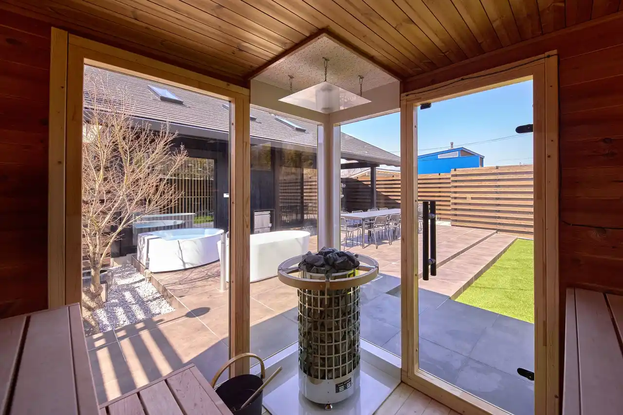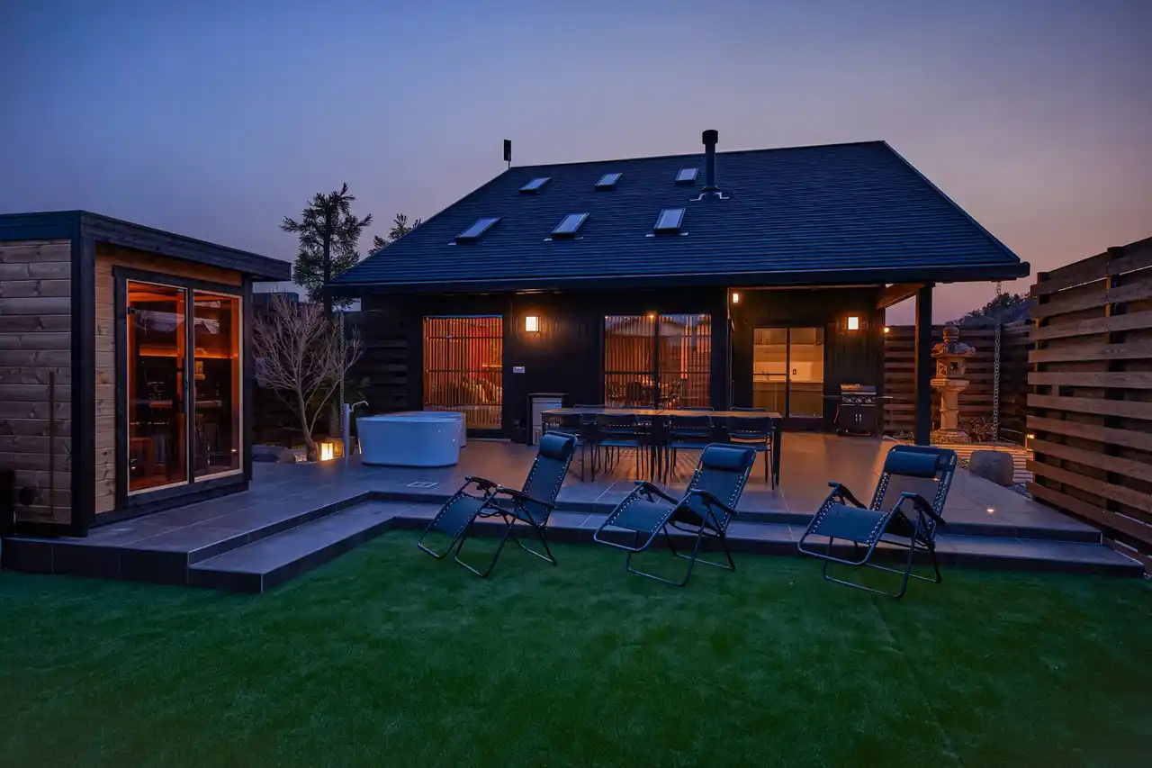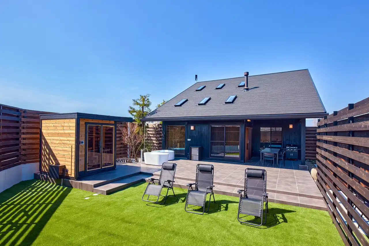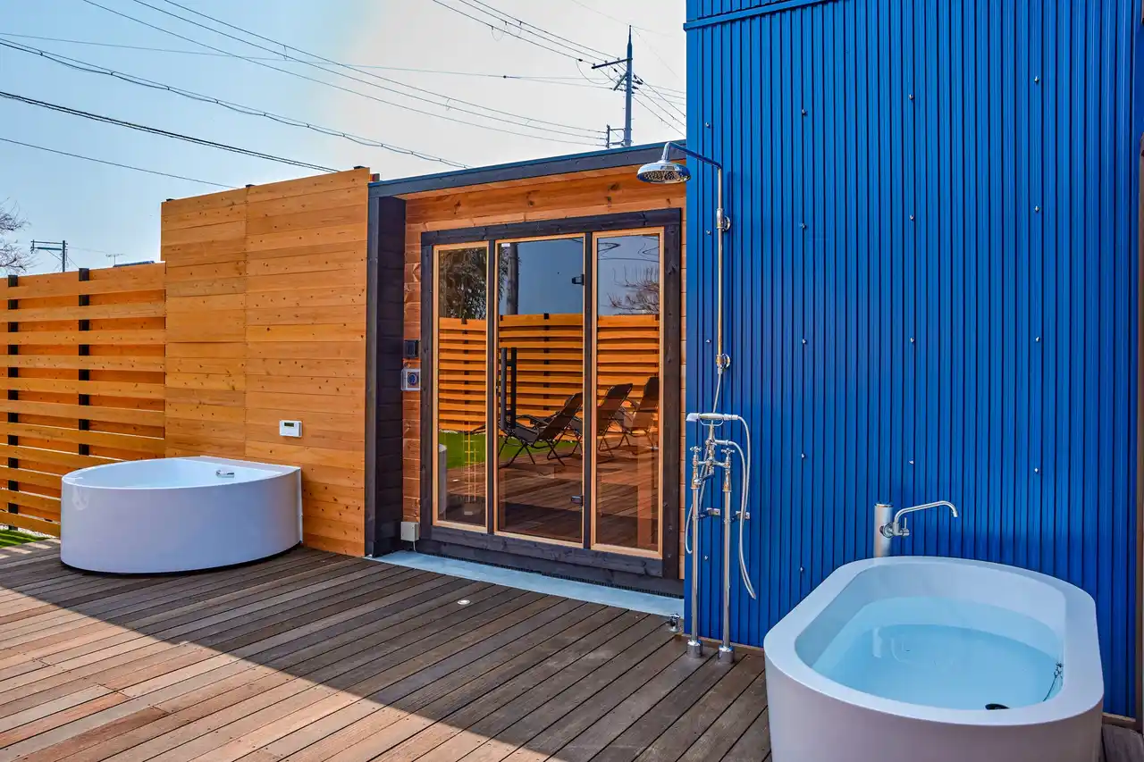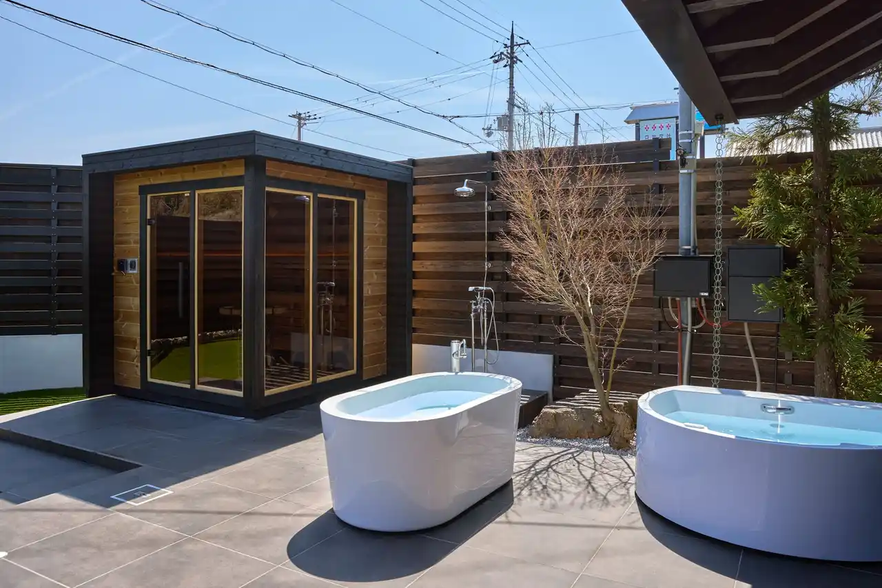 屋外にはサウナ・ジャグジー・水風呂を備えたプライベート空間を完備。サウナはガラス面から中庭を望める設計となっており、景色の広がりとともにゆったりと身体を温めることができます。サウナ後は外気浴スペースで風を感じながら、自然と一体になるととのいの時間を楽しめます。 |
