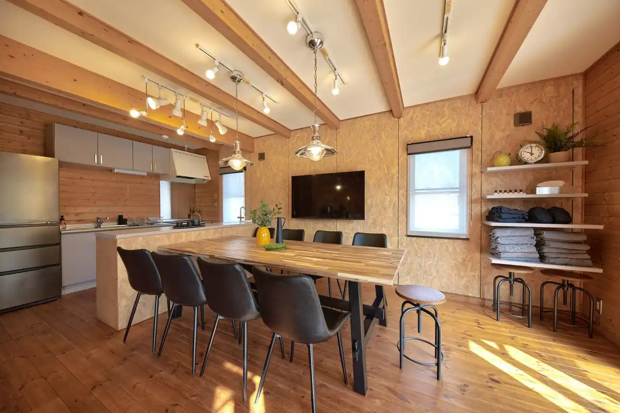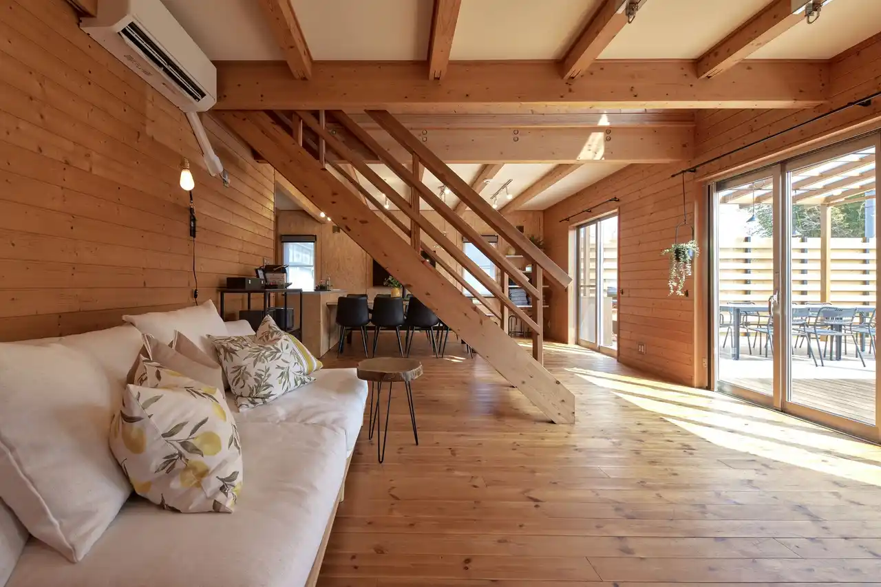 最大10名まで宿泊が可能。明るい木材を基調とした空間は、やさしい光に包まれ、自然と気分も軽やかになるような心地よさが広がります。グループでの滞在でもほどよい距離感を保ちながら、それぞれがリラックスして過ごせる設計です。 |