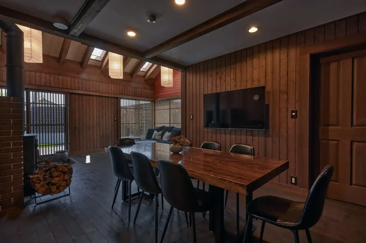 ログ材を活かした上質な室内空間に、吹き抜けの高い天井が生み出す伸びやかな開放感。視線が縦に抜けることで、実際以上の広がりを感じられ、グループでもゆとりを持って過ごせます。思い思いにくつろぎながらも、自然とひとつの空間で時間を共有できる設計です。 |