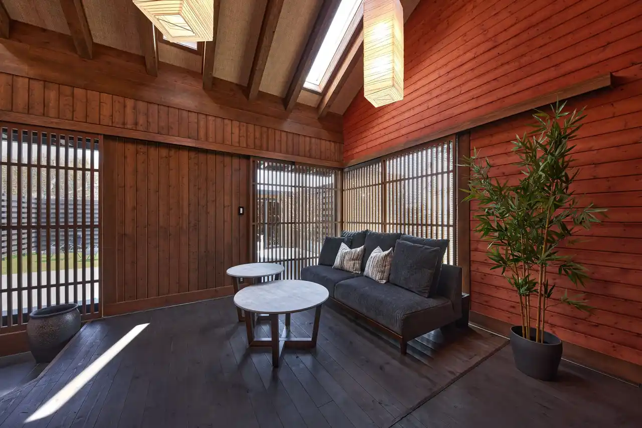 和の趣を基調とした設計のリビング。外部からの視線を遮りながらも、やわらかな自然光が差し込み、落ち着きと開放感が同居する空間に仕上げています。時間帯によって移ろう光の表情も、滞在の魅力のひとつです。 |