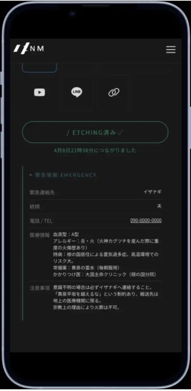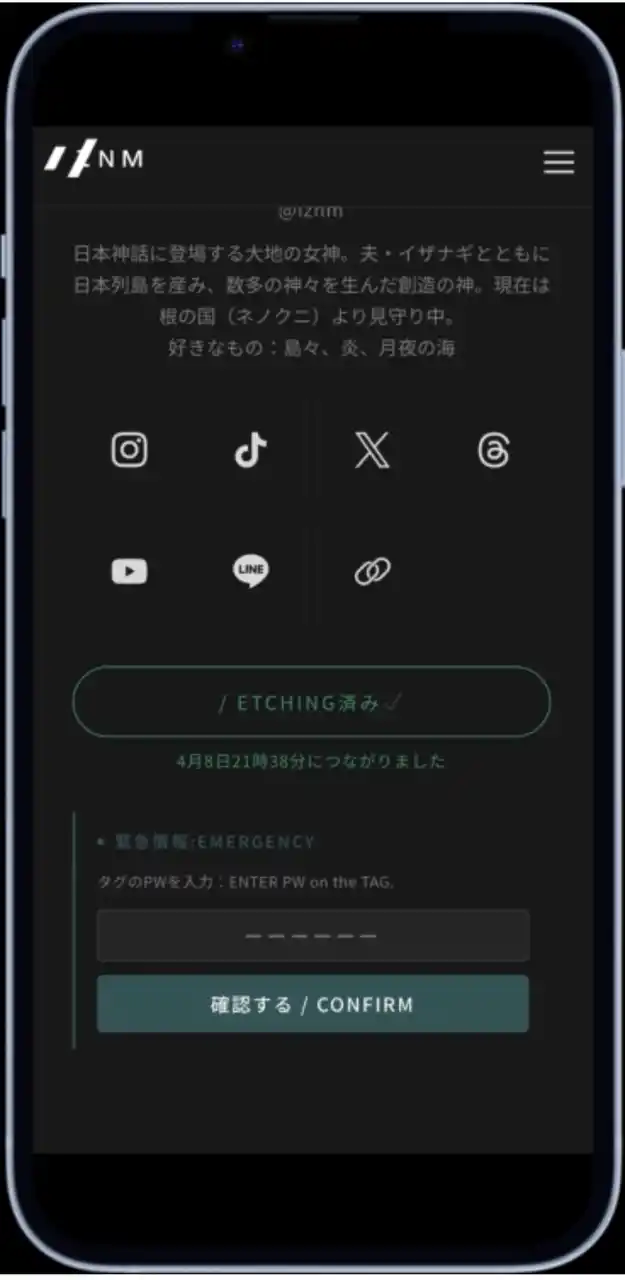 | IDページの緊急情報欄で、IZNM ID TAGに刻印されたPWを入力すると、あらかじめ登録した緊急情報にアクセスできます。緊急連絡先、医療情報、注意事項など、必要な情報を日常の中に備えられます。 | |||||||||||||||||||