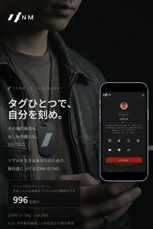 商品名:IZNM ID TAG 予約販売開始日時:2026年4月10日(金)18:00 発送開始予定:2026年5月初旬より順次発送 価格:4,980円(税込) 内容:IDタグ本体 / IZNM IDページ利用 / ETCHING機能 / 緊急情報アクセス機能 FOUNDER特典:先着1,000名様に付与 販売元:株式会社ダースー |