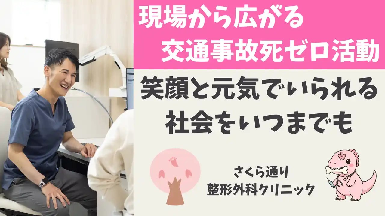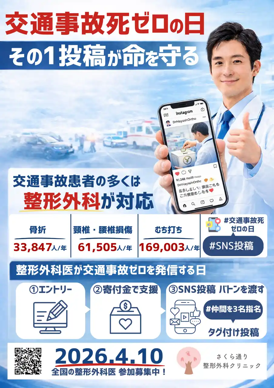 | 医療法人Eternabloom さくら通り整形外科クリニック(福井県福井市、院長:宇賀治修平)は、内閣府が定める「交通事故死ゼロを目指す日」(4月10日)に際し、寄付とSNS発信を通じた交通安全への意識啓発活動を行っています。本取り組みには、医療法人さわやか いでた整形外科クリニック(長崎県島原市)、うえだ整形外科クリニック(愛知県西尾市)、まつもと整形外科(福岡県久留米市)も賛同し、整形外科医同士のネットワークを通じて活動の輪が広がり始めています。 | |||||||||||||||||