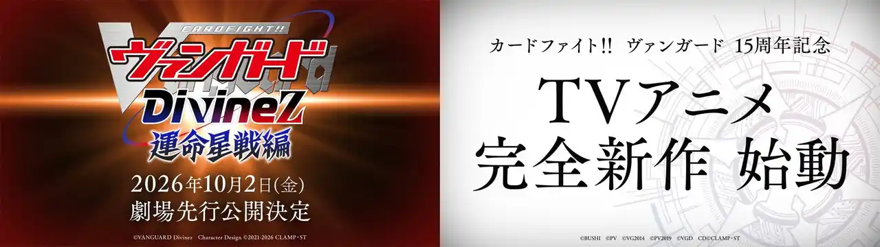 株式会社ブシロード(本社:東京都中野区、代表取締役社長:木谷高明)は、「カードファイト!! ヴァンガード Divinez 運命星戦編」を2026年10月2日(金)より劇場先行公開すること、および2027年に「カードファイト!! ヴァンガード」の15周年を記念した完全新作TVアニメシリーズを始動することをお知らせいたします。 |