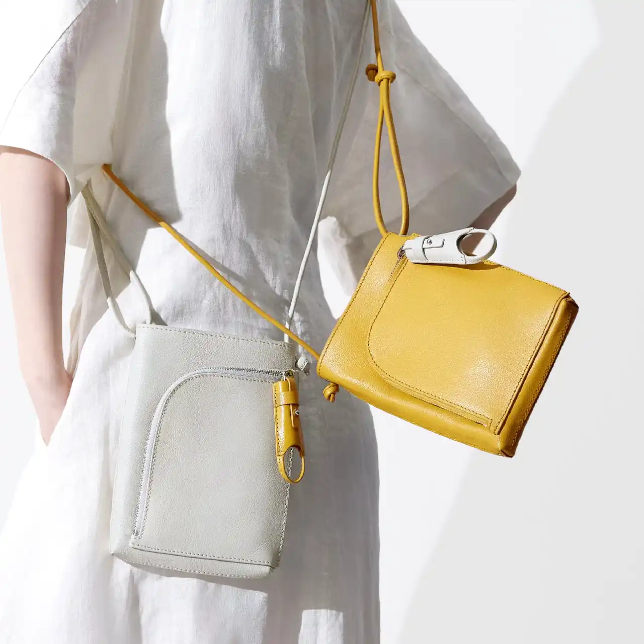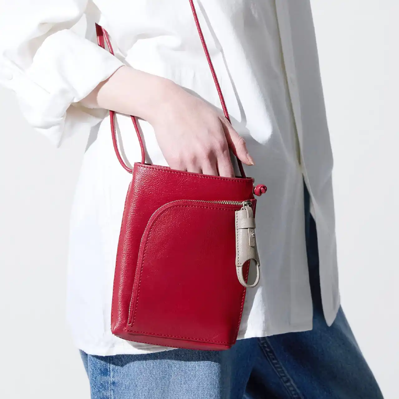 大切なものを守るジップポケット(Zipzip(TM)装着部)に加え、スマホやパスケースなど、すぐ取り出したいものを入れられる2つのオープンポケットを配置。「スマホとあと少し」の荷物をスマートに収納できます。わずか2cmのマチ(外縫い仕様)ながら、内部にペンホルダーも付いており、計算された構造により見た目以上のキャパシティを実現しました。ストラップ部分は、あえて調整金具をなくし、結び目によって長さを変えるカジュアルなスタイルを採用しています。ストラップを長めに設計しているため、性別を問わず(ユニセックス)、それぞれのスタイルに合わせたコーディネートを楽しめます。 |