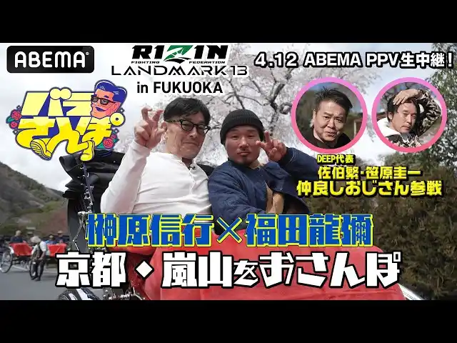 『バラ散歩』は、RIZINの榊原信行CEOが毎回、選手ゆかりの地を一緒に散歩しながら、その素顔や新たな一面を発見していく番組です。今回のゲストは、『RIZIN LANDMARK 13』に出場する福田龍彌選手。福田選手の地元・京都嵐山を舞台に、幼少期から現在に至るまでのルーツをたどりながら、“狩猟系格闘家”としても知られる唯一無二の素顔に迫ります。 |